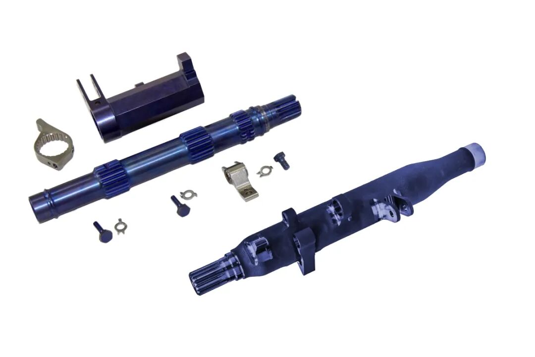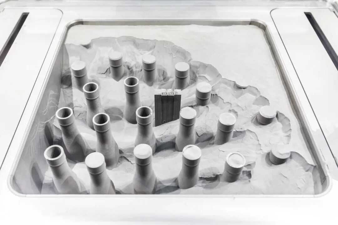 该舱门闩轴由 EOS M 400-4 型打印机制造,原材料为钛合金粉末。设备通过四束激光熔融粉末,以逐层堆叠的方式成型所需零部件。这种工艺可大幅减少原材料消耗,使成品重量更轻,同时保持与传统部件相当的结构强度,且单次打印流程最多可成型 28 件闩轴。