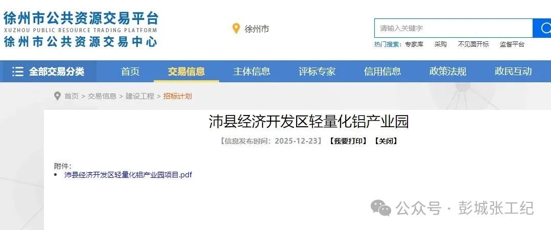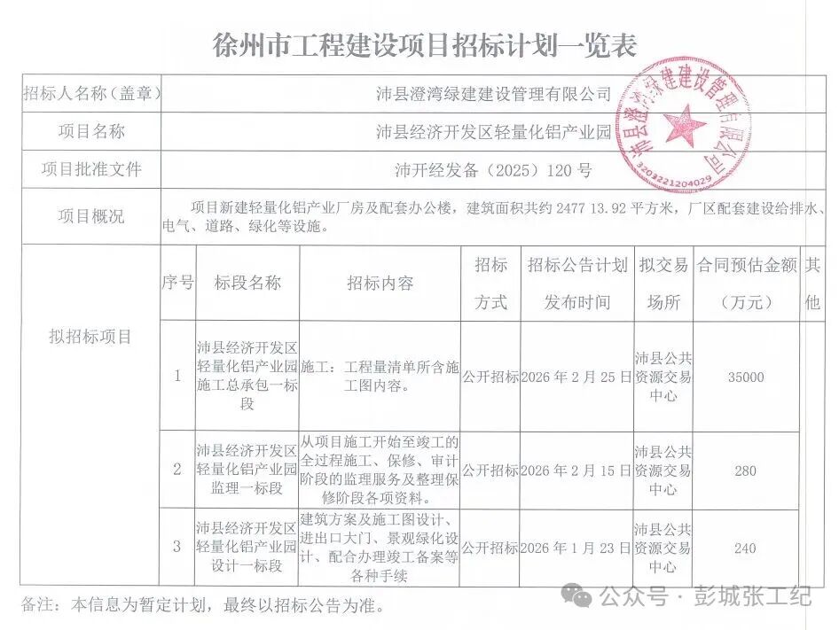 沛县经济开发区轻量化铝产业园施工总承包一标段 ,预计投资35000万元,预计招标时间为2026年2月25日,以及配套的监理标,设计标等招标工作。